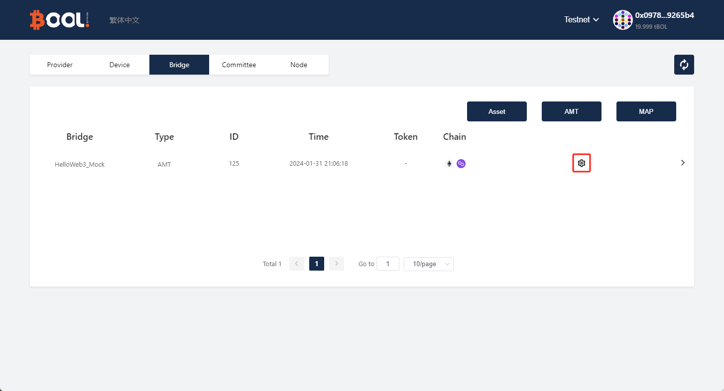<figure><img src="https://362083554-files.gitbook.io/~/files/v0/b/gitbook-x-prod.appspot.com/o/spaces%2FBPzEwQWF8yFmEtNtg2pz%2Fuploads%2F3tFEJr87h8SC8VQTqyWQ%2F1706708083718.png?alt=media&#x26;token=4c68fe8d-c5cf-4309-b1d4-fdc4d2ff7e40" alt=""><figcaption><p>Enable a new chain - Open the bridge's setting</p></figcaption></figure>